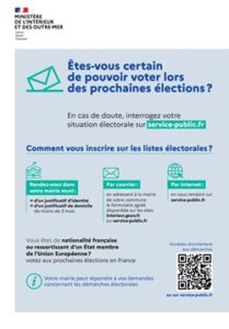 Pour voter, il faut être âgé d’au moins 18 ans la veille du jour du scrutin, et être inscrit sur les listes électorales. Vous pouvez vérifier si vous êtes inscrit sur la liste électorale en vous rendant sur la page : interroger votre situation électorale.