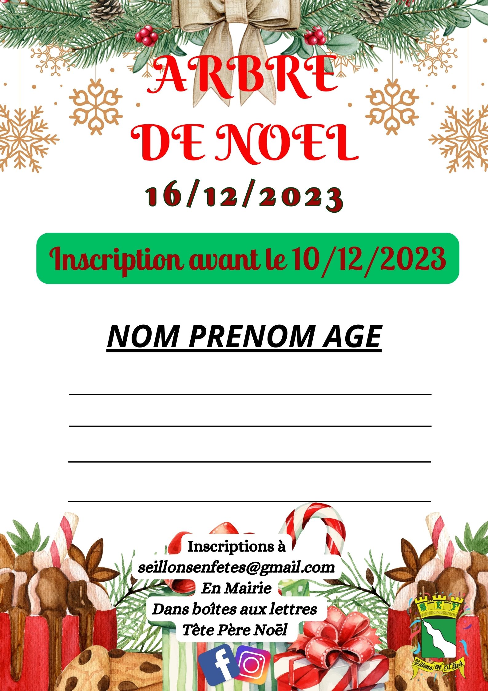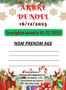 Inscription obligatoire avant le 10 décembre 2023 en remplissant le bulletin ( disponible en cliquant sur l’image) soit par e-mail à seillonsenfetes@gmail.com ou en le déposant directement soit à l’accueil de la mairie, soit dans la boite aux lettres de père Noël (place de la mairie).