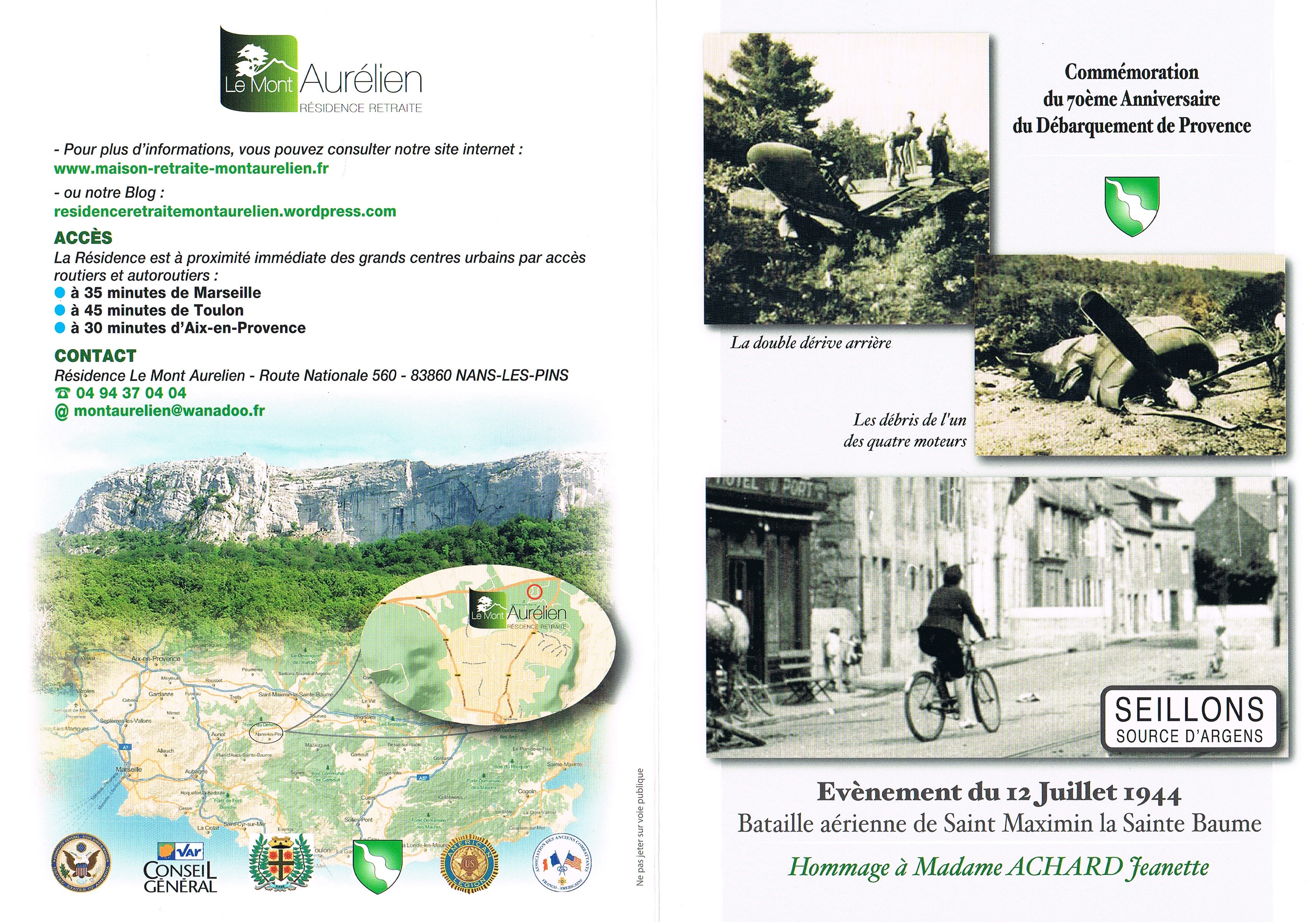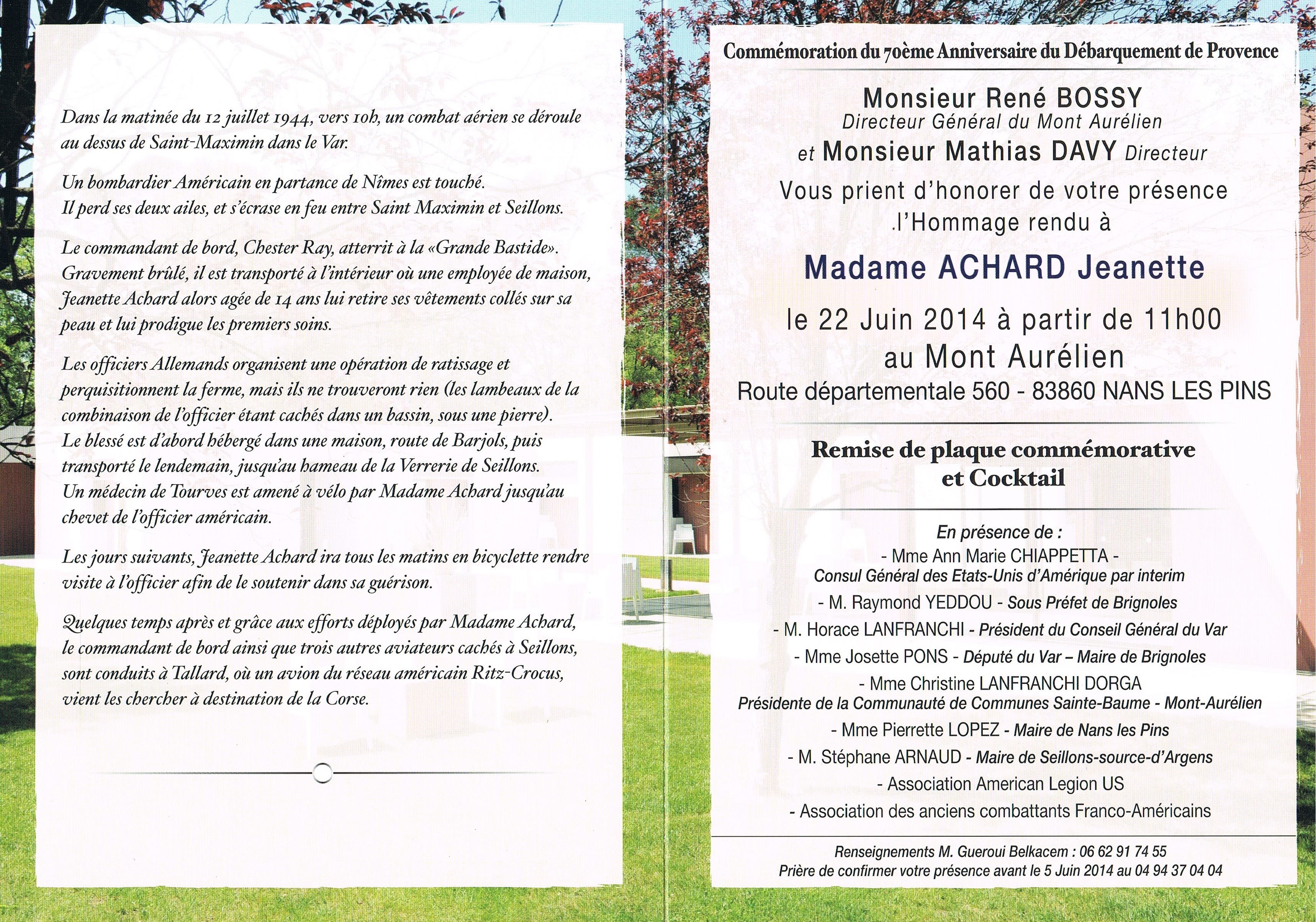 Environ 300 personnes sont attendues pour un vibrant hommage qui sera rendu à Madame Jeannette Achard (pensionnaire à la maison de retraite Mont-Aurélien – à Nans les Pins) pour le courage dont elle a fait preuve au cours de la seconde guerre mondiale.