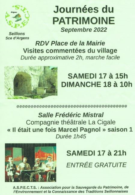 L’association ASPECTS ( Association pour la Sauvegarde du Patrimoine, de l’Environnement, des Connaissances et Traditions Seillonnaises) propose plusieurs animations.