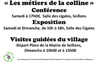 - une exposition sur les métiers de la colline : samedi et dimanche de 10h00 à 18h00 salle des cigales ; elle restera visible le lundi 22 septembre et le mardi 23 septembre (sur réservation) ;