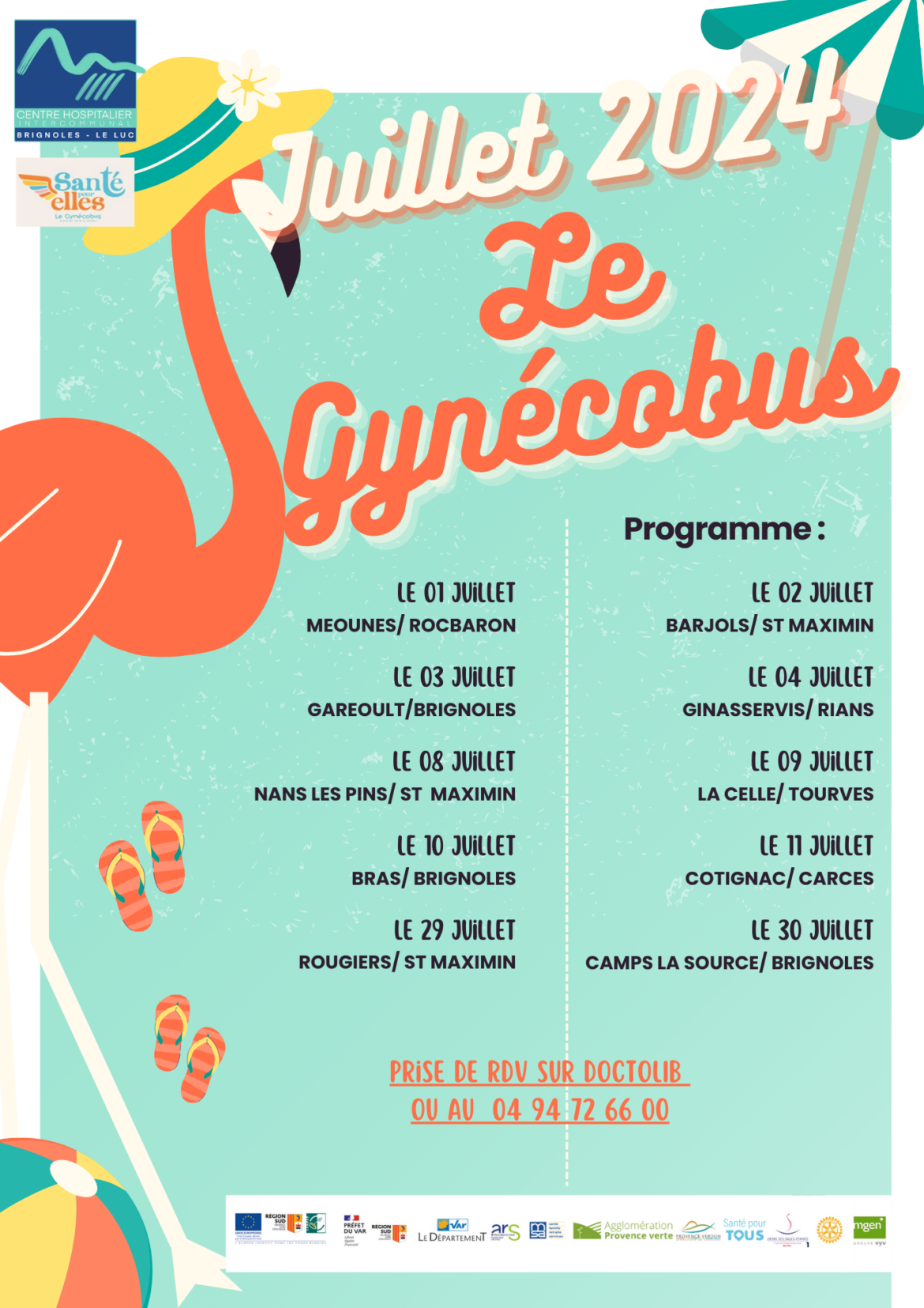 Pour le mois de juillet 2024, le gynécobus du centre Hospitalier Intercommunal de Brignoles – Le Luc vous informe de sa tournée. Le gynécobus c’est la possibilité pour tous d’avoir accès à :