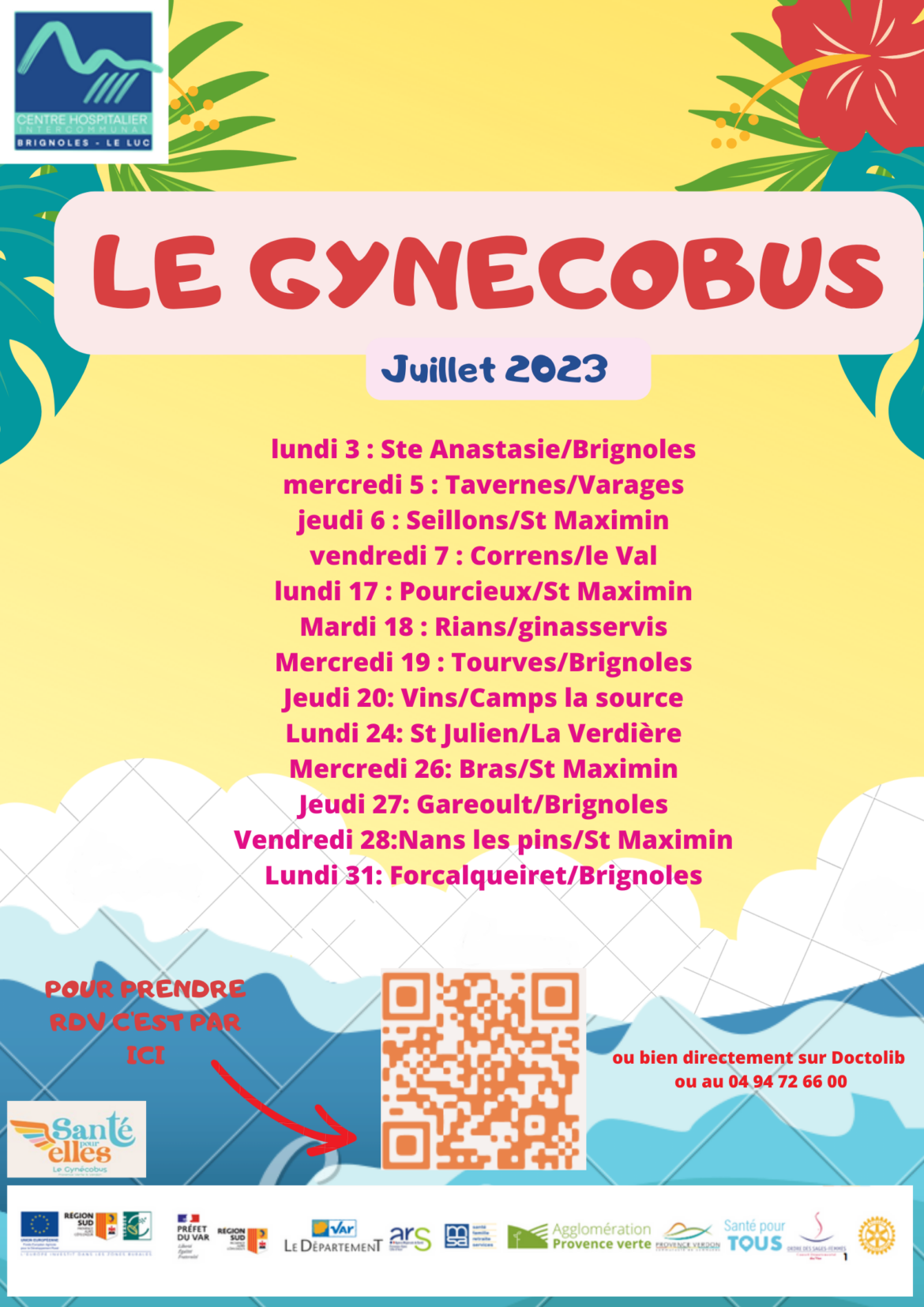 Pour ce mois de juillet 2023, le gynécobus du centre Hospitalier Intercommunal de Brignoles – Le Luc vous informe de sa tournée. Le gynécobus c’est la possibilité pour tous d’avoir accès à :