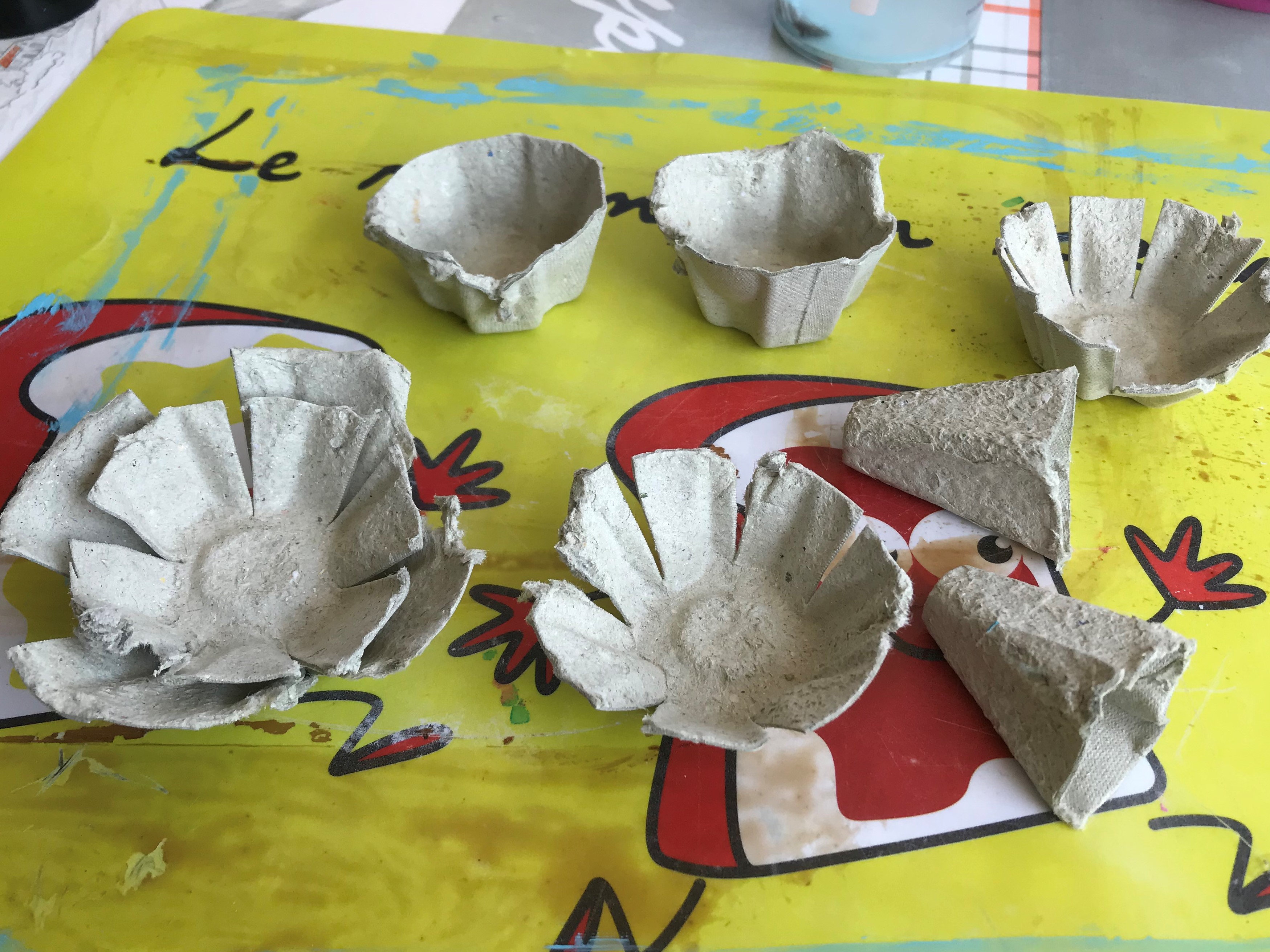 Ouvrez la boite d’œufs. Le principe est de découper autour des « cônes » du milieu, pour former la fleur.