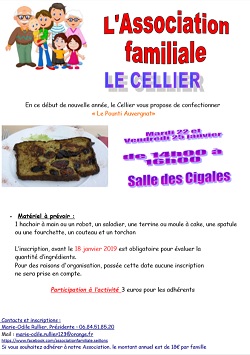 Inscrivez vous impérativement avant le vendredi 18 janvier auprès de la présidente de l’association familiale Marie-Odile, soit par téléphone au 06.84.51.85.20, soit par mail : marie-odile.rullier123@orange.fr, Participation à l’activité 3 euros pour les adhérents.