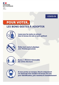 - Lavez-vous les mains en entrant dans le bureau de vote et en le quittant: Des flacons de gel Hydroalcoolique seront à votre disposition à l’entrée et à la sortie des deux bureaux de vote.