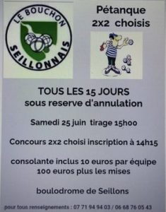 L’association le Bouchon seillonnais lance sa saison de concours de pétanque en deux à deux choisi. Tous les quinze jours si les conditions sont réunies pour une après-midi de pétanque, les bénévoles du bouchon seillonnais donne rendez-vous à tous les amoureux de la pétanque au boulodrome.