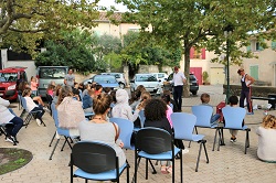 Profitant d’un dernier après midi ensoleillé sur la place du village, une trentaine d’enfants, des parents et quelques promeneurs, ont pu applaudir un spectacle en plein air dans un style commedia dell’arte.