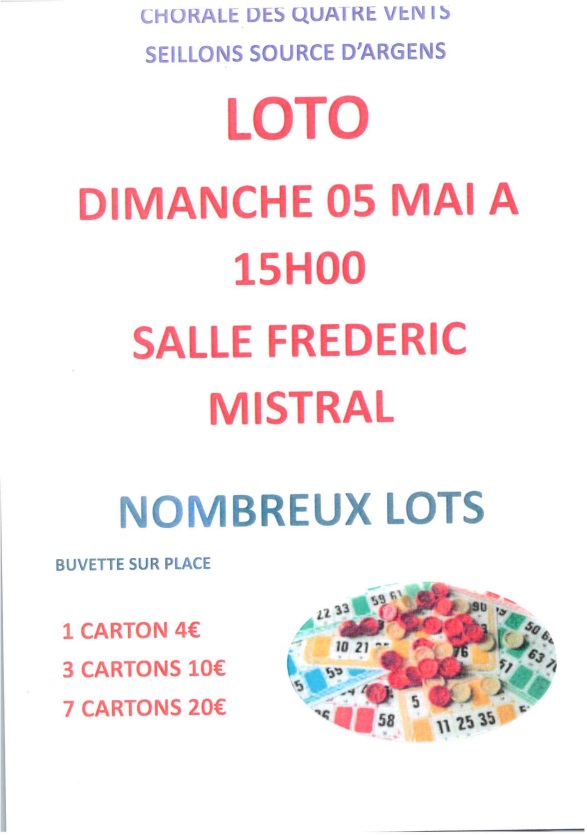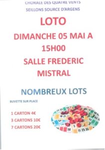 associations LOTO de la chorale by LeSeillonnais 30avr écrit par LeSeillonnais 30avr 17 La chorale des 4 vents vous invite le : Dimanche 5 mai dès 15h00 salle Frédéric Mistral pour un loto avec … … de nombreux lots à gagner. 83470associationassociationschoralechorale des 4 ventslotosalle frederic mistralseillonsseillons sourceseillons source d'argensvivre a seillonsvivreaseillons 0 commentaires 0 FacebookTwitterPinterestEmail LeSeillonnais article précédent Trampoline : du championnat du Var au championnat de France article suivant Arrêté communal n°129 You may also like Une journée VTT inoubliable avec le club des... 23mar Tennis club Seillonnais: des joueurs qui excellent 20mar Un week-end victorieux pour les jeunes judokas de... 13mar Un week-end de réussite pour nos trampolinistes au... 13mar Stage de Peinture : Laissez libre cours à... 12mar Boule : Un Week-end de Compétition et de... 11mar Atelier Taille des Oliviers : Inscrivez-vous dès maintenant... 8mar OupS : exposition de mars 2025 5mar Message de l’association les petits héros 5mar Ateliers : « retour à l’emploi des femmes » 5mar Leave a Comment Cancel Reply Save my name, email, and website in this browser for the next time I comment. Δ