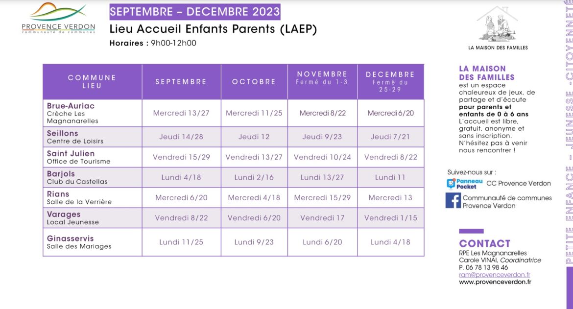 La Maison des familles est le Lieu d’Accueil Enfants-Parents (LAEP) itinérant de la communauté de communes Provence Verdon. Deux professionnels de la Petite Enfance, formés à l’écoute, accueillent les enfants de la naissance à six ans accompagnés de leurs parents, ou d’un adulte référent, dans un cadre chaleureux et bienveillant facilitant la rencontre, l’écoute, et la relation parent-enfant…