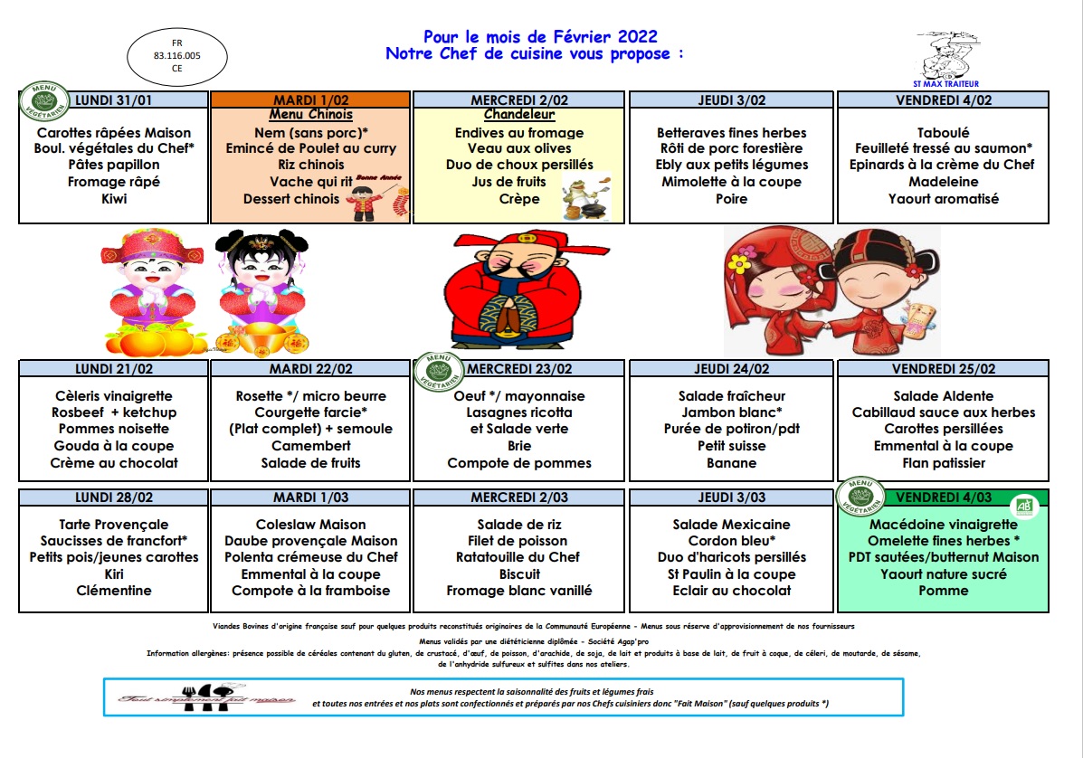 La société Saint-Max traiteur vous transmet le menu de la cantine scolaire du mois de février.