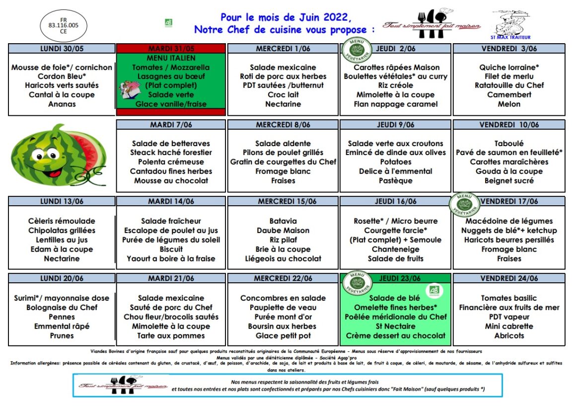La société Saint-Max traiteur vous transmet le menu de la cantine scolaire du mois de juin.
