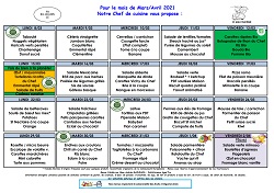 - Chaque mois son repas à thème pour cette période deux menus: le lundi 15 mars: fait du bien à ta planète et le vendredi 2 avril : Pâques.