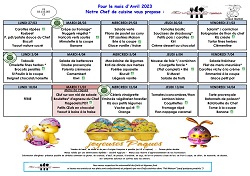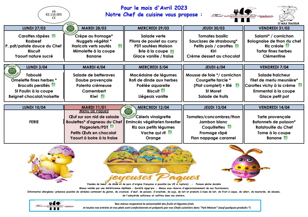 La société Saint-Max traiteur vous transmet le menu de la cantine scolaire pour ce mois d’avril 2023.