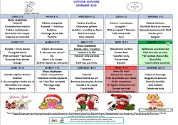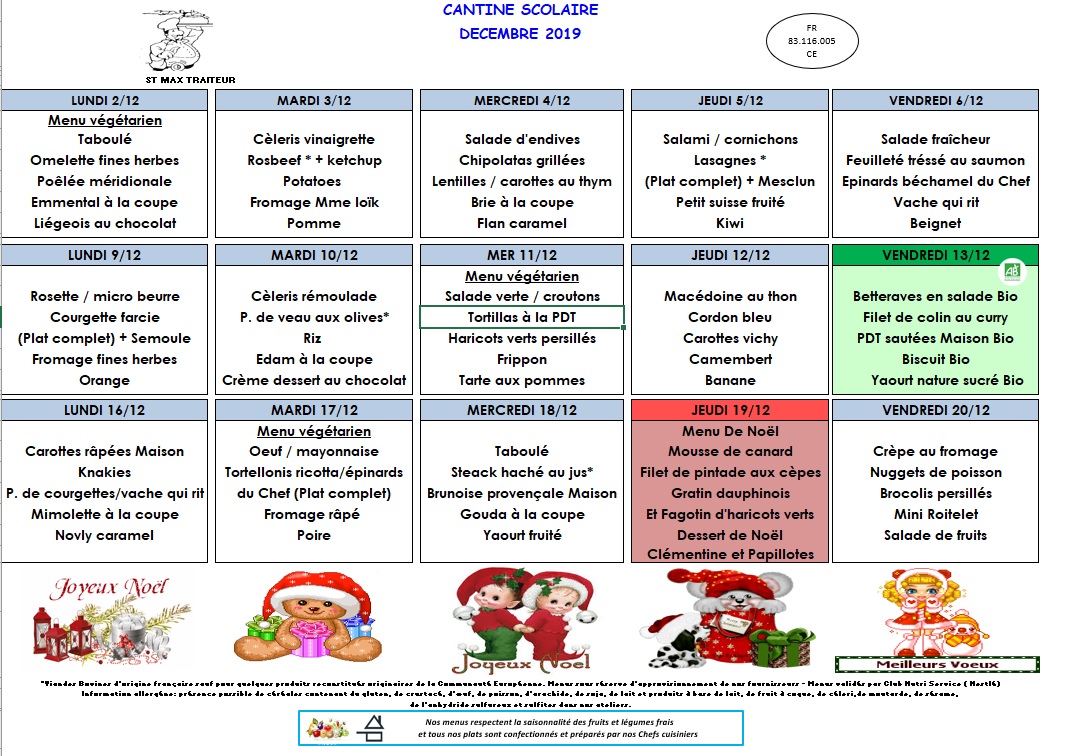 La société Saint-Max traiteur vous transmet le menu de la cantine scolaire pour le mois de décembre 2019.