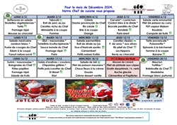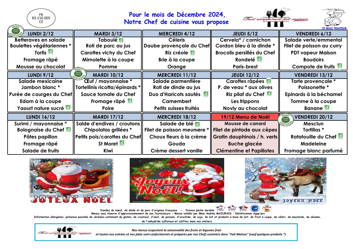 La société Saint-Max Traiteur vous présente le menu de la cantine scolaire pour ce mois de décembre 2024.