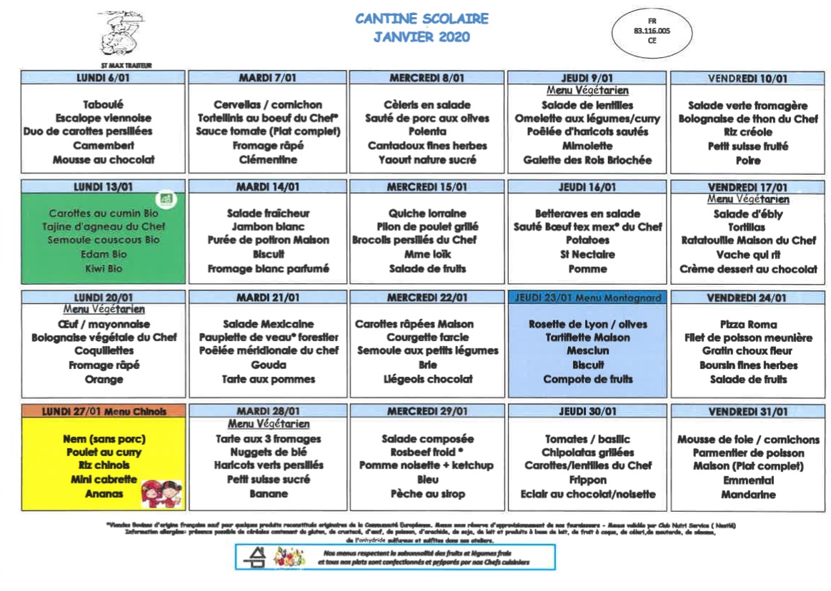 La société Saint-Max traiteur vous transmet le menu de la cantine scolaire pour le mois de janvier 2020.