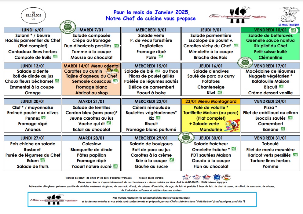 La société Saint-Max Traiteur vous présente le menu de la cantine scolaire pour ce mois début d’année 2025