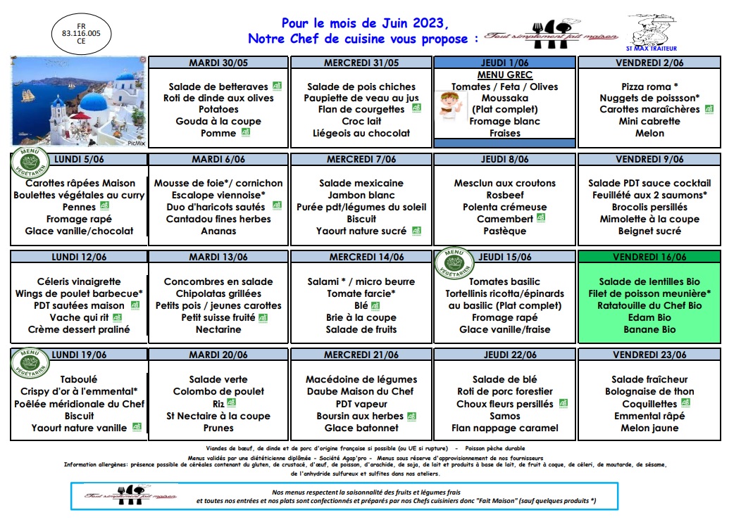 La société Saint-Max traiteur vous transmet le menu de la cantine scolaire pour ce mois de juin 2023.