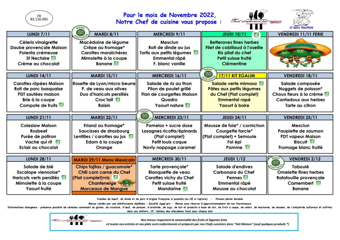 La société Saint-Max traiteur vous transmet le menu de la cantine scolaire pour ce mois de novembre 2022.