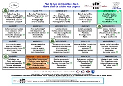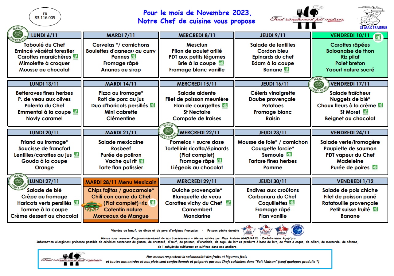 La société Saint-Max traiteur vous transmet le menu de la cantine scolaire pour ce mois de novembre 2023.
