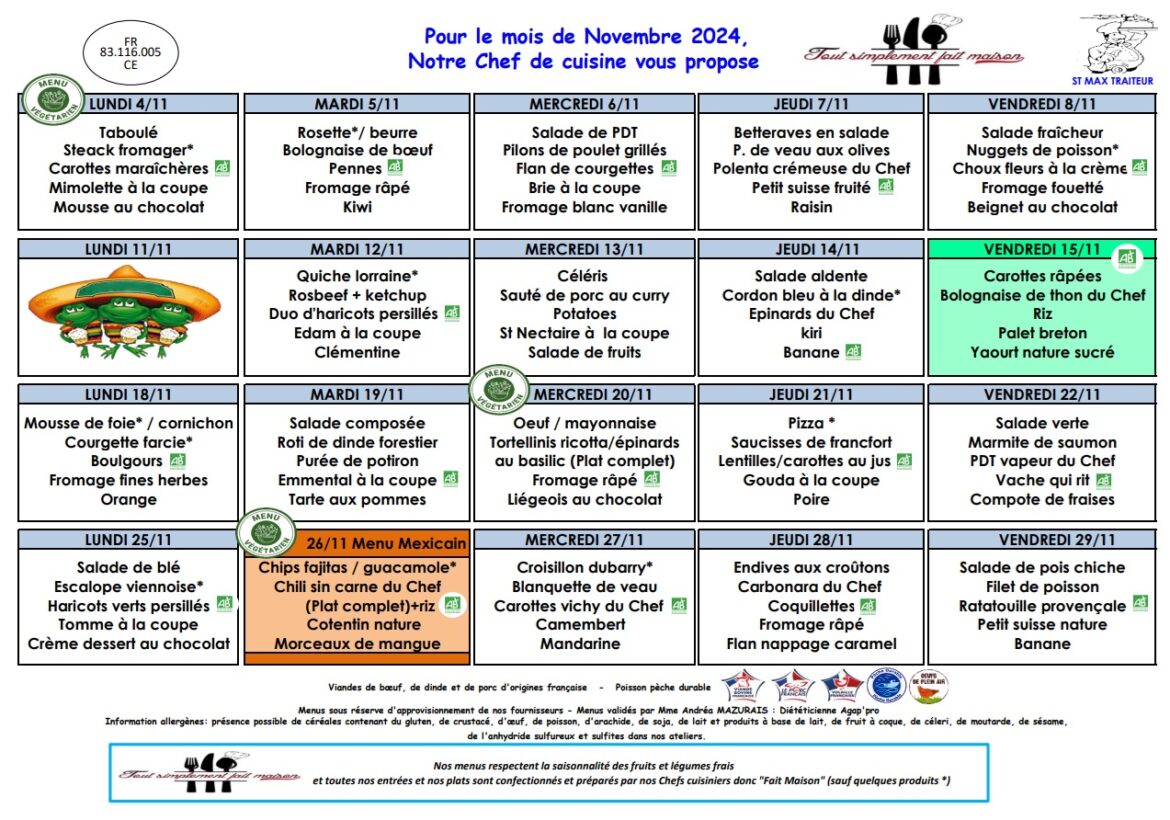 La société Saint-Max Traiteur vous présente le menu de la cantine scolaire pour ce mois d’octobre 2024.