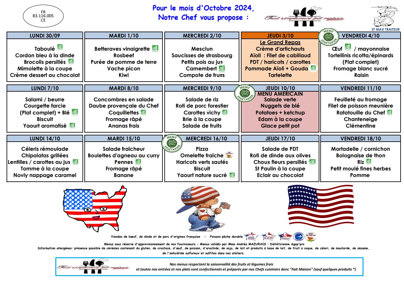 La société Saint-Max Traiteur vous présente le menu de la cantine scolaire pour ce mois d’octobre 2024.