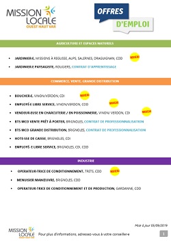 De nombreuses offres d’emploi ( alternance, CDI, Interim ou CDD) gérées par la Mission Locale Ouest Haut Var sont régulièrement mises en ligne. Attention, l’inscription à la Mission locale est obligatoire pour postuler.
