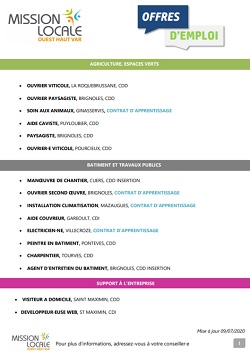 De nombreuses offres d’emploi ( alternance, CDI, Interim ou CDD) gérées par la Mission Locale Ouest Haut Var sont régulièrement mises en ligne. Attention, l’inscription à la Mission locale est obligatoire pour postuler.