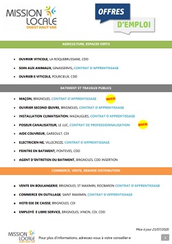 De nombreuses offres d’emploi ( alternance, CDI, Interim ou CDD) gérées par la Mission Locale Ouest Haut Var sont régulièrement mises en ligne. Attention, l’inscription à la Mission locale est obligatoire pour postuler.