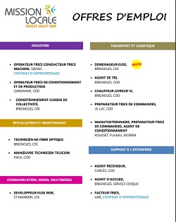 De nombreuses offres d’emploi ( alternance, CDI, Interim ou CDD) gérées par la Mission Locale Ouest Haut Var sont régulièrement mises en ligne. Attention, l’inscription à la Mission locale est obligatoirepour postuler.