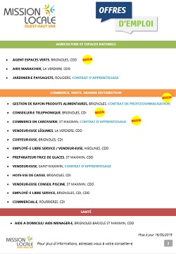 De nombreuses offres d’emploi ( alternance, CDI, Interim ou CDD) gérées par la Mission Locale Ouest Haut Var sont régulièrement mises en ligne. Attention, l’inscription à la Mission locale est obligatoire pour postuler.