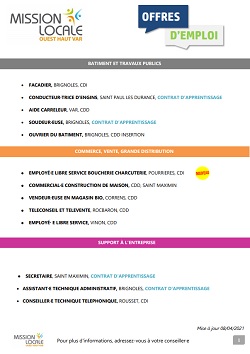 De nombreuses offres d’emploi ( alternance, CDI, Interim ou CDD) gérées par la Mission Locale Ouest Haut Var sont régulièrement mises en ligne. Attention, l’inscription à la Mission locale est obligatoire pour postuler.