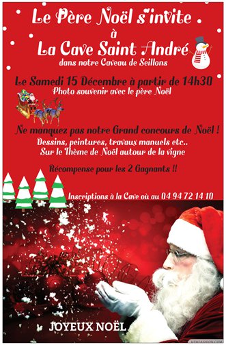 professionnelsvie quotidienne Noël à la cave Saint André by LeSeillonnais 4déc écrit par LeSeillonnais 4déc 18 La cave coopérative Saint André vous invite à son animation de Noël. Rendez vous le: samedi 15 décembre à partir de 14h30 Au programme: Visite du père Noël et possibilité de faire une photo souvenir pour les enfants Grand concours créatif: « Noël autour de la vigne » 83470cave coopérativecave saint andrénoelpère noëlseillonsseillons sourceseillons source d'argensvivre a seillonsvivreaseillons 0 commentaires 0 FacebookTwitterPinterestEmail LeSeillonnais article précédent arrêté du 10 décembre 2018 article suivant Téléthon des enfants You may also like Horaires été déchèterie 7mar 19 mars 2025 : coupure électrique 6mar Ateliers : « retour à l’emploi des femmes » 5mar Objet trouvé : Un petit doudou cherche son... 28fév Sophie Darras : Votre alliée financière de proximité 21fév Atelier « CONFIANCE EN SOI » pour les enfants de... 31jan 15 janvier 2025 : coupure électrique 26déc « Magie de Noël : La Municipalité Enchante les... 24déc 18 décembre 2024 : Coupure de courant pour... 12déc Un joyeux marché de Noël 2024 11déc Leave a Comment Cancel Reply Save my name, email, and website in this browser for the next time I comment. Δ