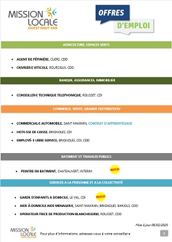 De nombreuses offres d’emploi ( alternance, CDI, Interim ou CDD) gérées par la Mission Locale Ouest Haut Var sont régulièrement mises en ligne. Attention, l’inscription à la Mission locale est obligatoire pour postuler.