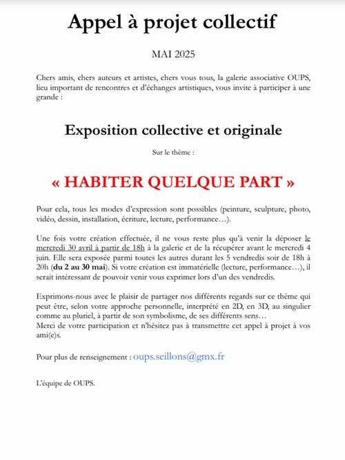 « Chers amis, chers auteurs et artistes, chers vous tous, à l’occasion de ce mois de MAI qui se veut être un moment important avec les beaux jours qui arrivent, les longs week-end grâce au jours fériés, l’équipe de OUPS vous invite à participer à une : Exposition collective et originale.