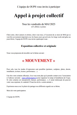 » Chers amis, chers auteurs et artistes, chers vous tous, à l’occasion de ce mois de MAI qui se veut être un moment important avec les beaux jours qui arrivent, les longs week-end grâce au jours fériés, l’équipe de OUPS vous invite à participer à une : Exposition collective et originale.