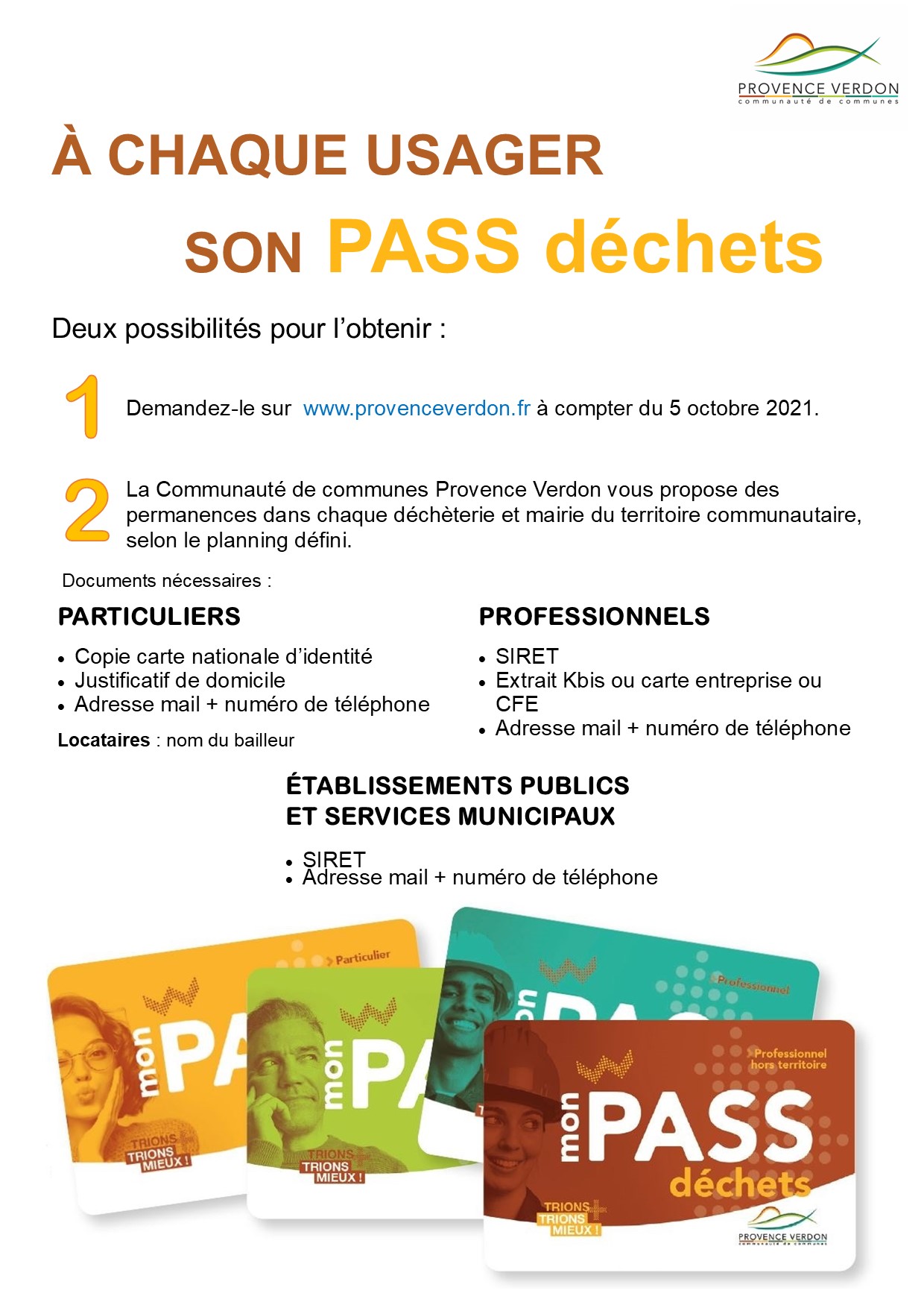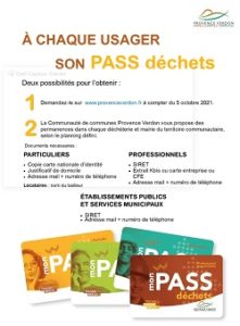 Vous avez deux possibilités pour obtenir votre PASS déchets. À compter du 5 octobre 2021, la demande de ce PASS DECHETS pourra se réaliser en ligne sur www.provenceverdon.fr