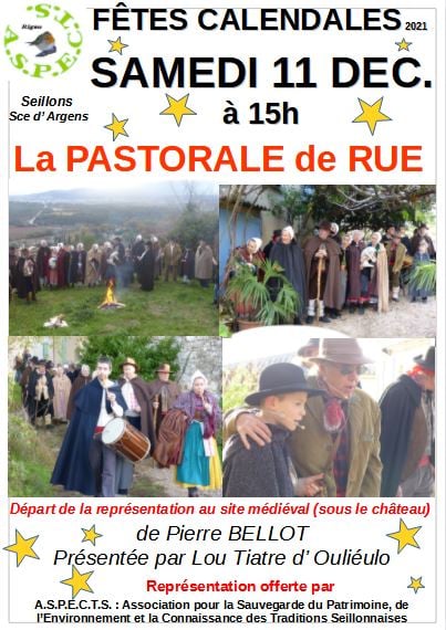 L’association ASPECTS vous invite à découvrir la Pastorale de Pierre Bellot interprétée par la troupe de Lou tiatre d’Ouliéulo. Cette comédie traditionnelle du Noël Provençal en 4 actes se déroulera en différents lieux du village: