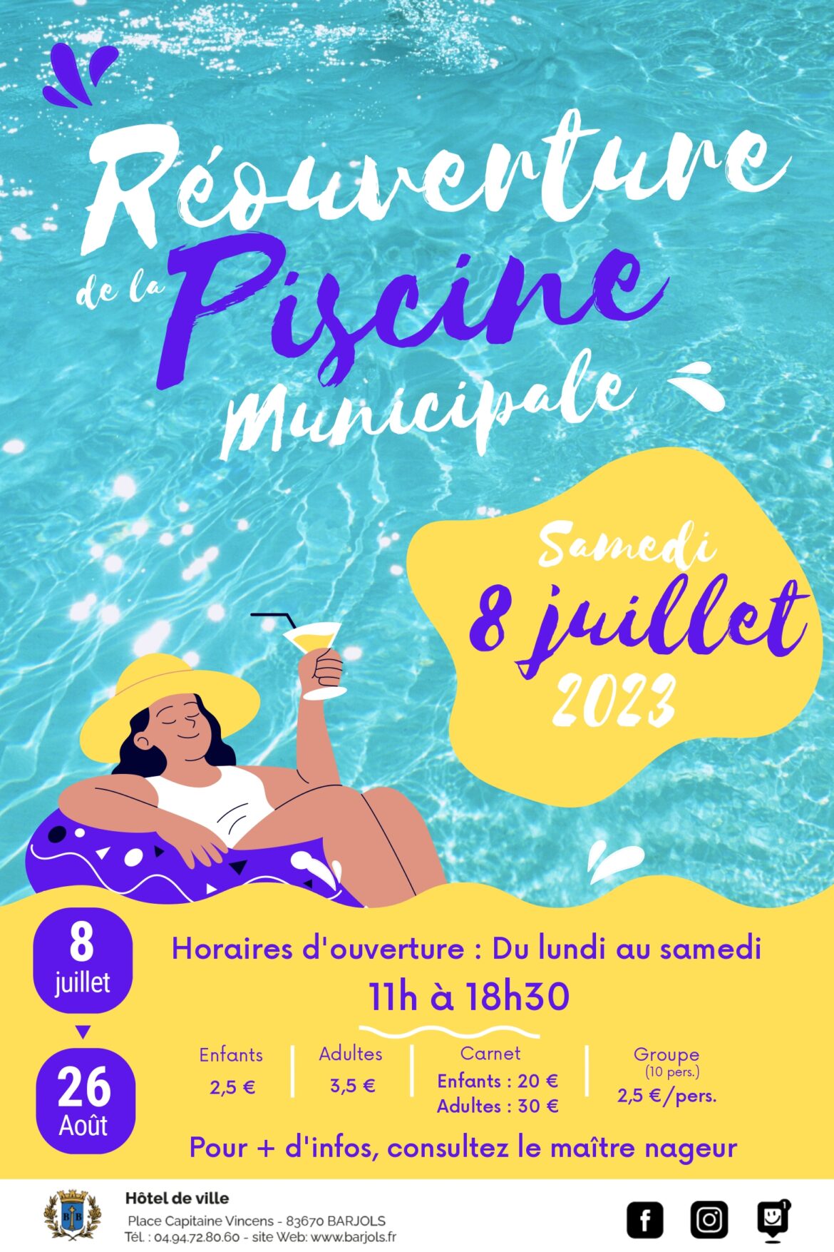 « La Municipalité de Barjols a le plaisir de vous annoncer que la piscine municipale rouvre ses portes au public à partir du samedi 8 juillet 2023 selon les horaires suivants : du 8 juillet au 26 août 2023 de 11h00 à 18h30.