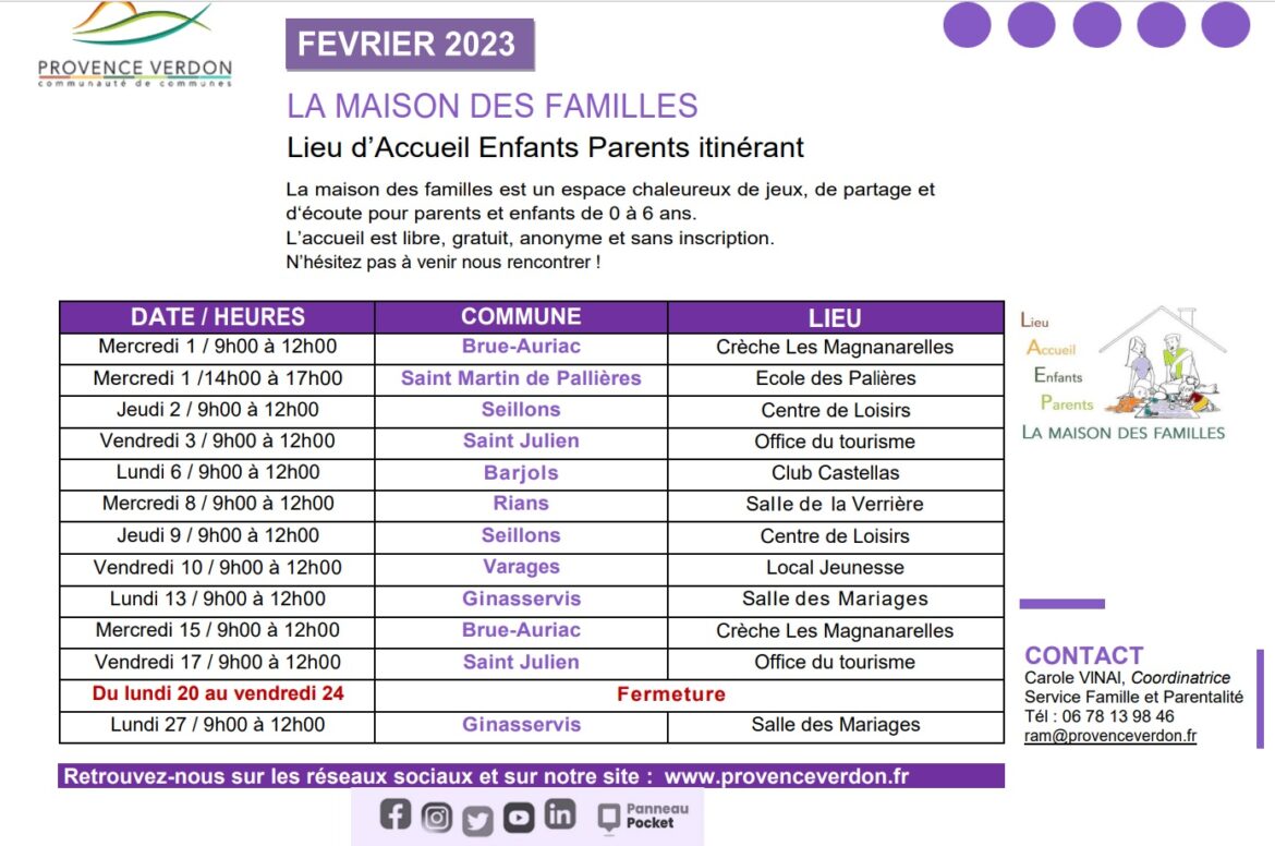 La Maison des familles est le Lieu d’Accueil Enfants-Parents (LAEP) itinérant de la communauté de Provence Verdon, deux professionnels de la Petite Enfance, formés à l’écoute, accueillent les enfants de la naissance à six ans accompagnés de leurs parents ou d’un adulte référent, dans un cadre chaleureux et bienveillant facilitant la rencontre, l’écoute et la relation parent enfant.