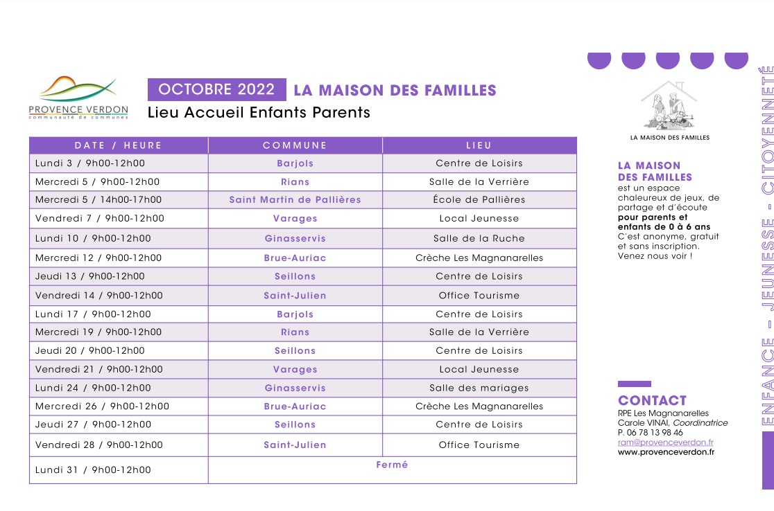 La Maison des familles est le Lieu d’Accueil Enfants-Parents (LAEP) itinérant de la communauté de Provence Verdon, deux professionnels de la Petite Enfance, formés à l’écoute, accueillent les enfants de la naissance à six ans accompagnés de leurs parents ou d’un adulte référent, dans un cadre chaleureux et bienveillant facilitant la rencontre, l’écoute et la relation parent enfant.