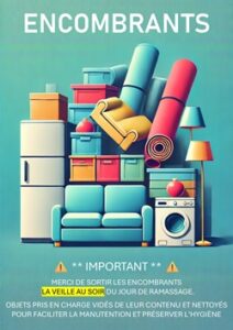 Les encombrants, ou « monstres », désignent des objets volumineux qui, de par leur taille ou leur poids, ne peuvent être jetés dans les conteneurs de tri sélectif ou des ordures ménagères. Ces objets doivent être déposés à la déchetterie ou pris en charge par le service communal.
