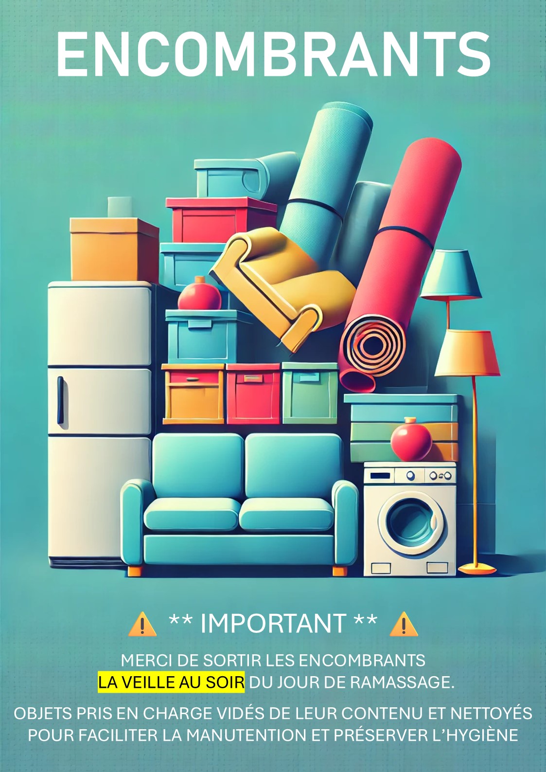 Il est strictement interdit de déposer des encombrants dans des lieux publics ou hors des emplacements prévus. Ces actes sont répréhensibles par la loi.