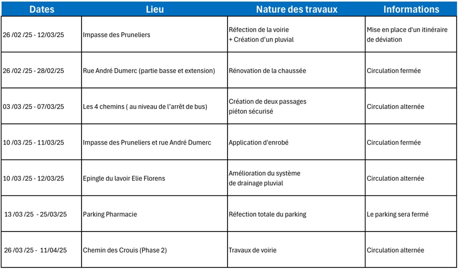Dans le cadre de l’amélioration des infrastructures routières, des travaux de voirie ont débuté le 26 février et s’étendront sur une durée estimée à 7 semaines.