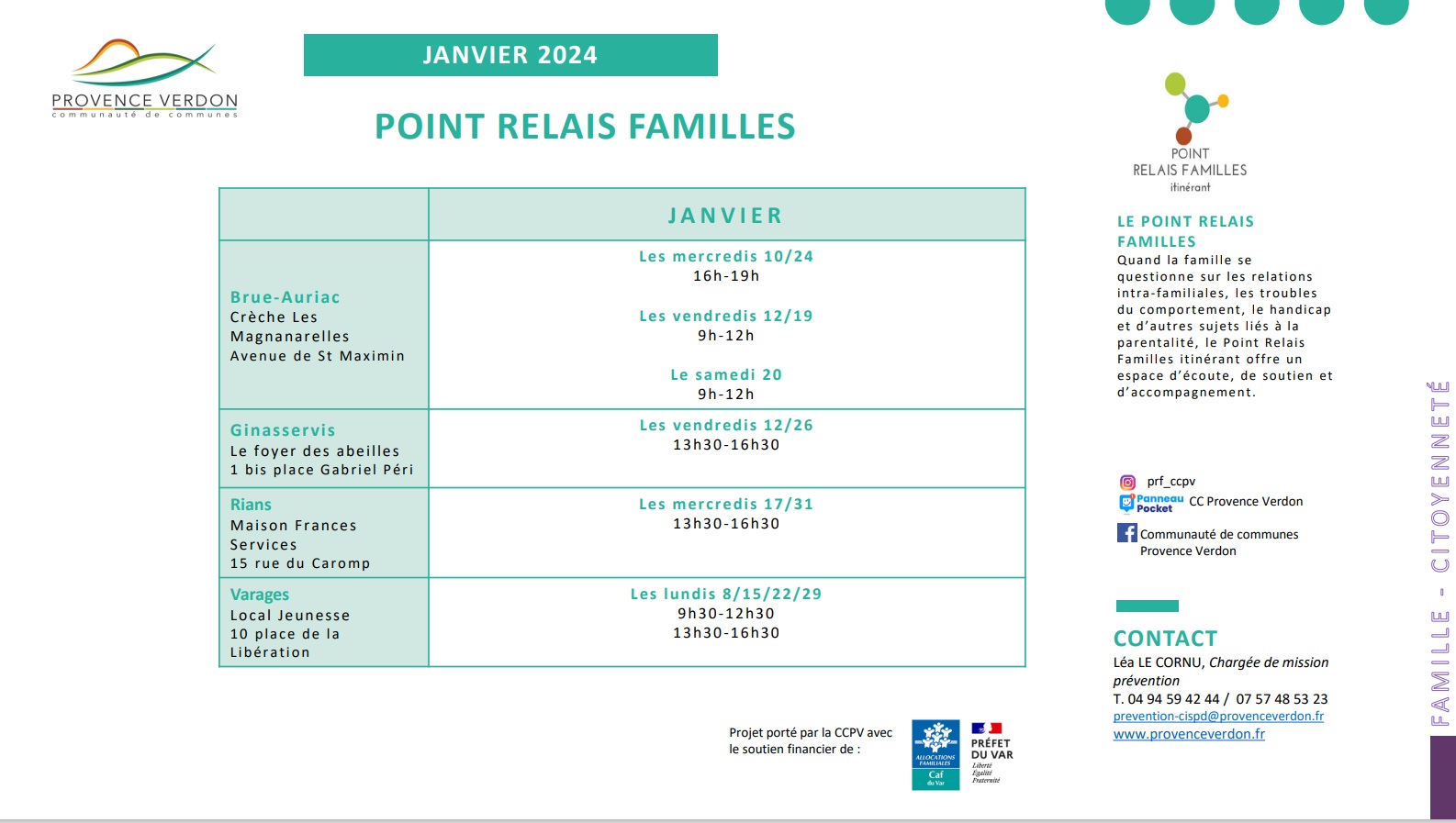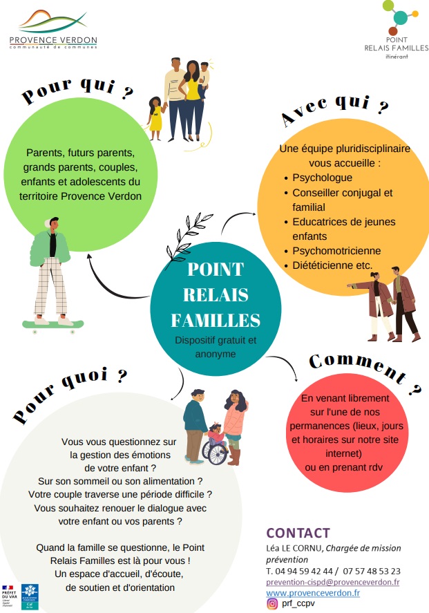 Pour rappel, le Point Relais Familles est un dispositif gratuit et anonyme à destination des parents, futurs parents, grands-parents, couples, enfants et adolescents du territoire Provence Verdon.
