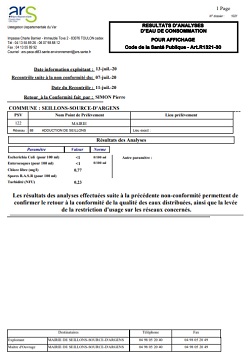 Aujourd’hui, les autorités sanitaires (ARS), Le prestataire des mairies de Seillons et de Brue Auriac au niveau du captage, les gendarmes continuent leurs investigations. Nous ne manquerons pas de vous communiquer les résultats transmis et les conclusions de cette enquête dès qu’ils nous seront connus.
