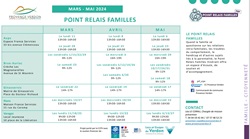 L’équipe du Point Relais Familles vous transmet le nouveau planning pour les mois de mars, avril et mai 2024.