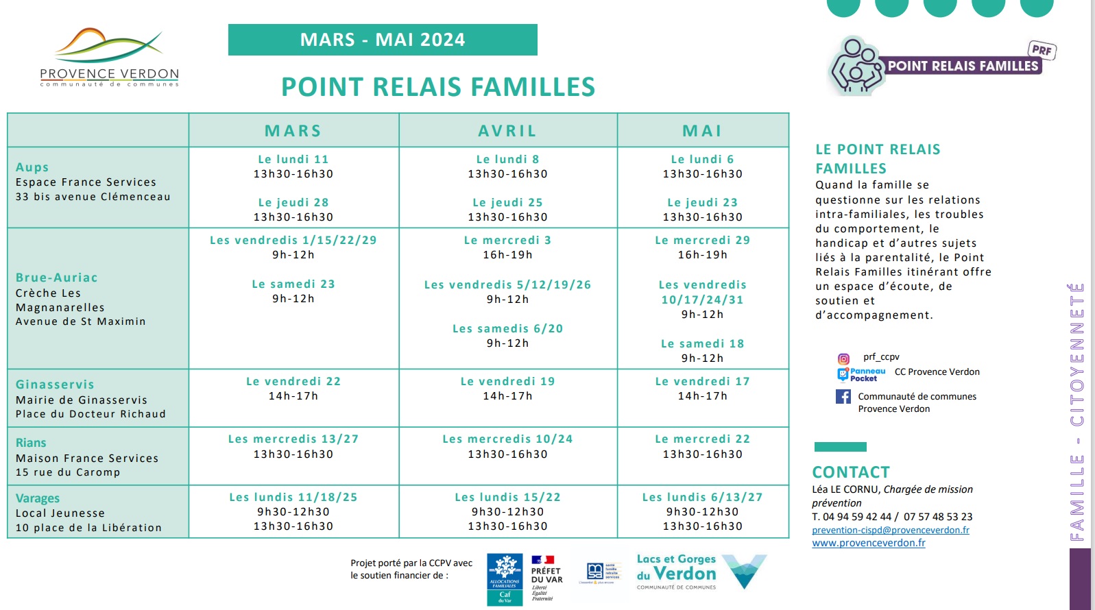 Pour rappel, le Point Relais Familles est un dispositif gratuit et anonyme à destination des parents, futurs parents, grands-parents, couples, enfants et adolescents du territoire Provence Verdon.