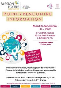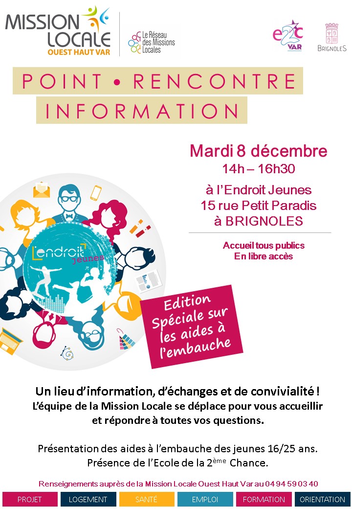 Le prochain Point Rencontre Information, organisé par la Mission Locale Ouest Haut Var, en partenariat avec l’Ecole de la 2ème Chance et le Service Jeunesse de la Ville de Brignoles aura lieu: